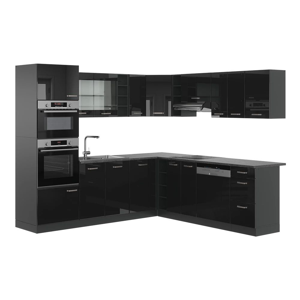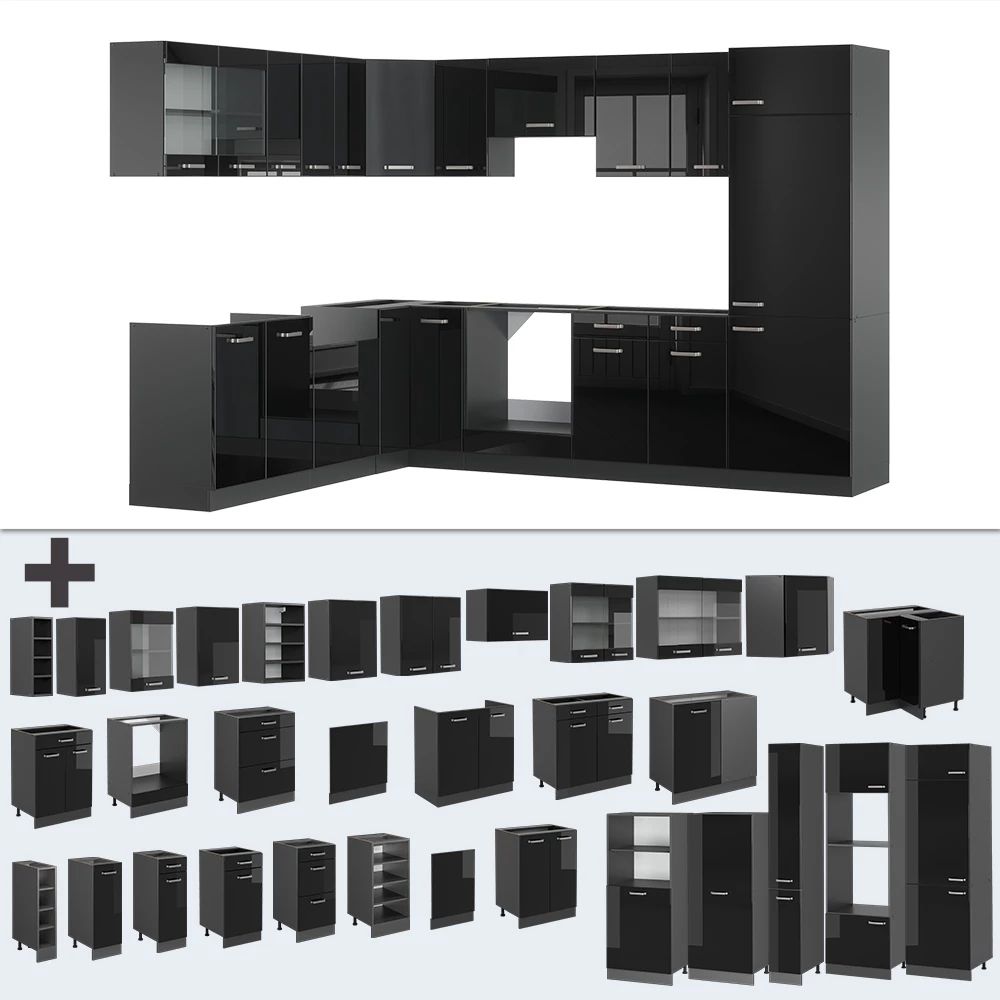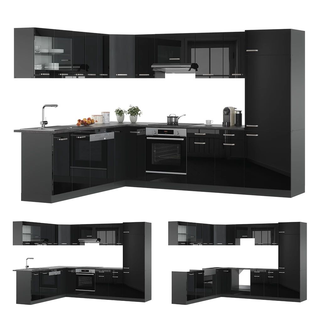 Intens zwart met een spiegelgladde afwerking.